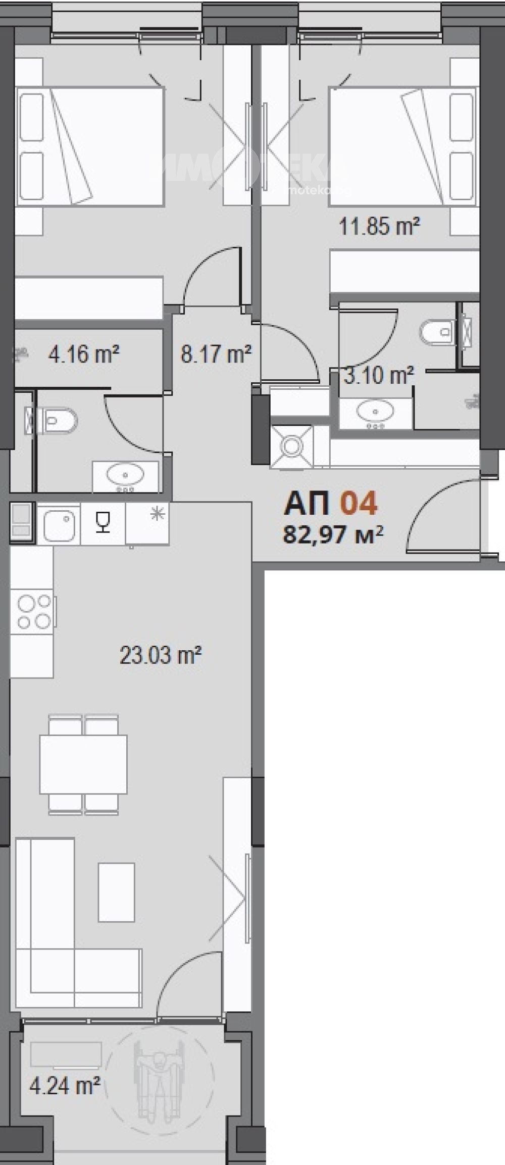 Двустаен апартамент, състоящ се от дневна с кухненси бокс, две спални , баня с тоалетна отделна тоалетна и тераса.