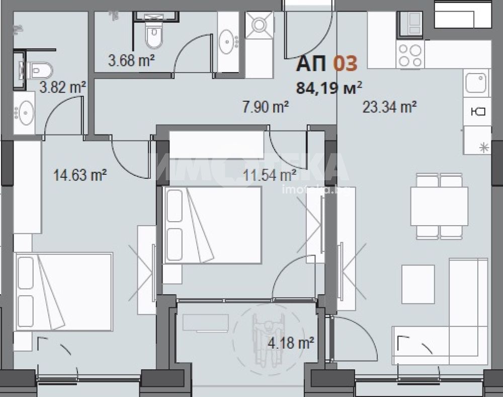 Двустаенстаен апартамент, състоящ се от дневна с кухненси бокс, две спални , баня с тоалетна, втора баня с тоалетна и тераса. ЗП 83кв.м.