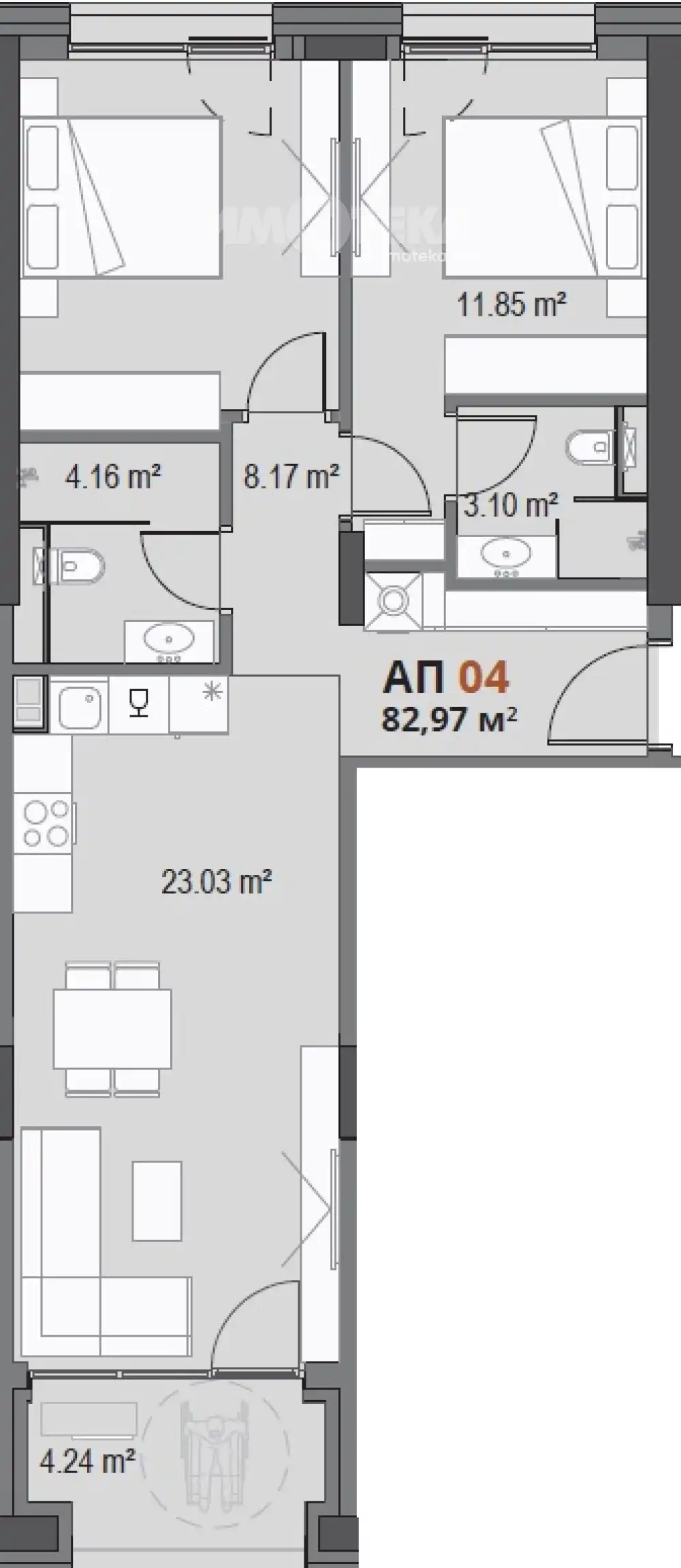 Тристаен апартамент, състоящ се от дневна с кухненси бокс, две спални , баня с тоалетна, втора баня и тераса. ЗП 81кв.м.