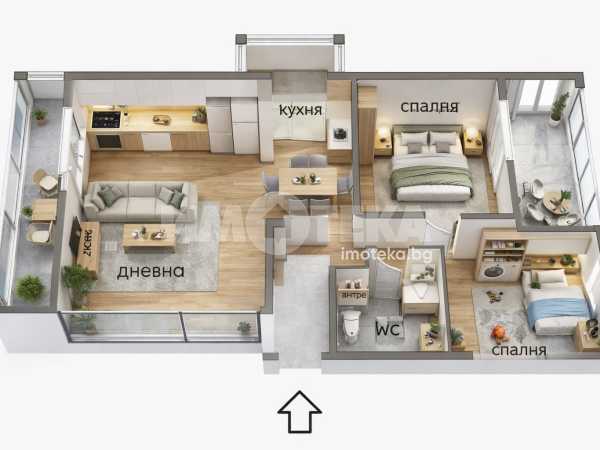 Жилището се състои от коридор, дневна, кухня, две спални, баня, тоалетна и две тераси, едната от които е остъклена.