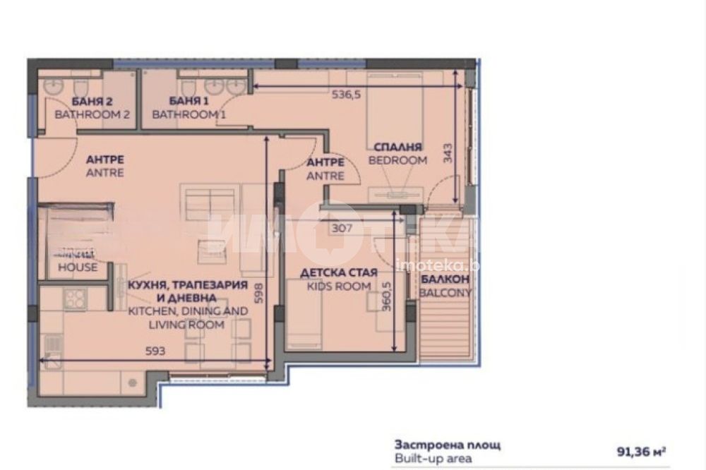 Апартаментът е ситуиран на втори етаж - 1/П и се състои от просторна дневна с кухня и трапезария, детска стая, спалня със собствен санитарен възел, отделна тоалетна и склад.ЗП -91,36 кв.м. Към жилището се предлагат външни и подземни паркоместа/ гаражи.
