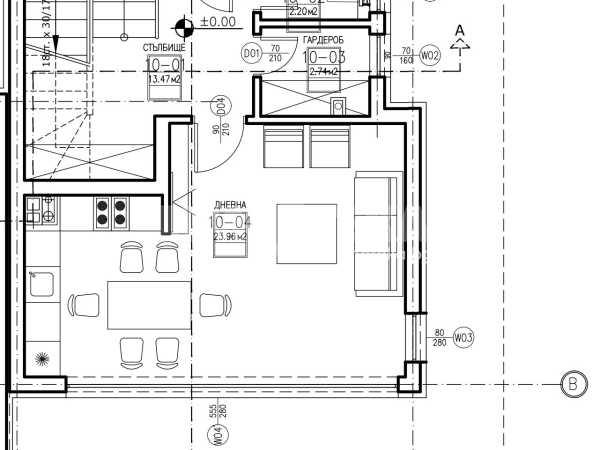 Партерен етаж: входно преддверие, техническо/гардеробно помещение, тоалетна, стълбищна клетка и хол с трапезария и кухня. Холът, трапезарията и кухнята са решени като общо пространство. Холната част е ориентирана в посока югозапад и от нея има пряк достъп до вътрешния двор. Кухненската част е ориентирана в посока запад. Възможност за преработка и разширяване на дневната зона с около 15 кв.м.