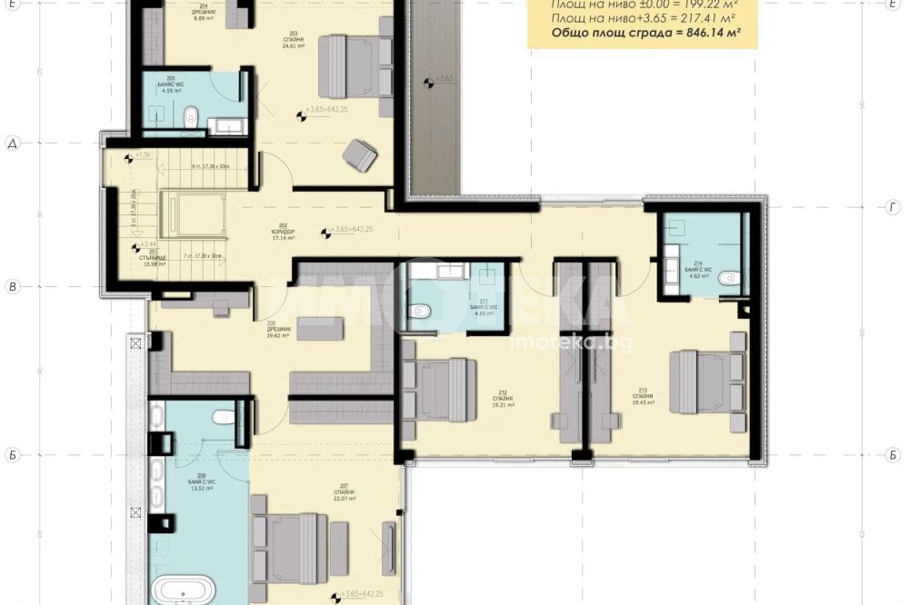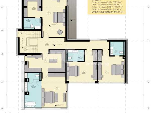 2-ри етаж: предверие, родителска спалня с баня, дрешник и тераса, две спални с бани и тоалетни, спалня с баня, дрешник и тераса.