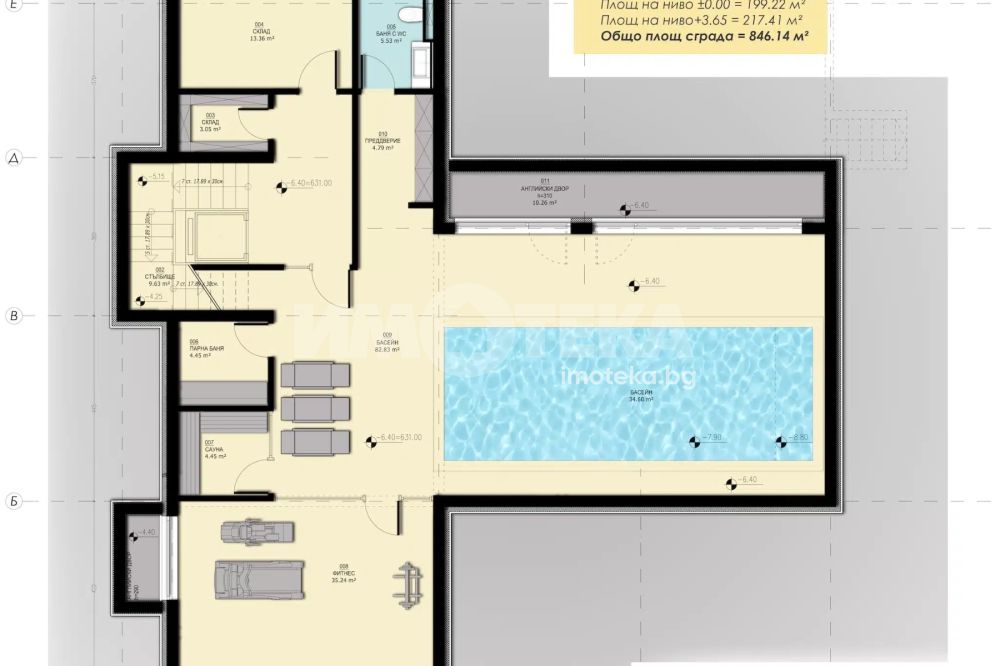 На самостоятелно ниво къщата разполага с Фитнес, Подземен басейн, Парна баня, Сауна.