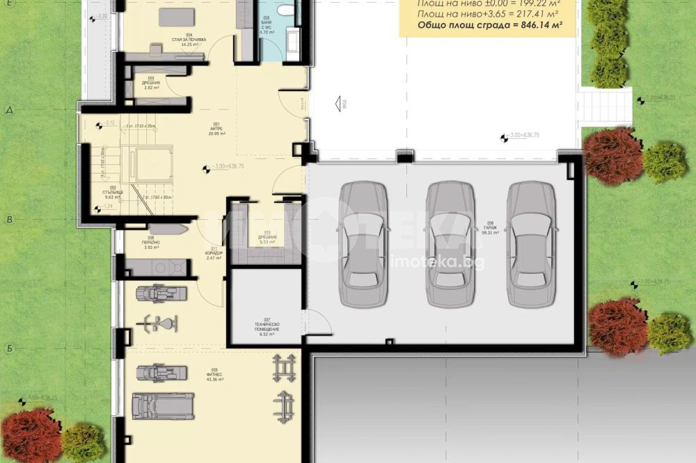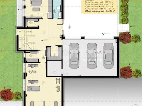 Къщата се състои от: Сутерен: входно антре, двоен гараж и две парко места пред него, фитнес с помещение за сауна, перално помещение, техническо помещение, спалня с баня и тоалетна, дрешник;