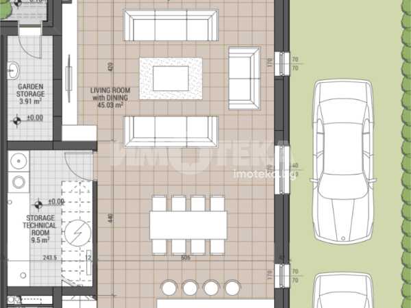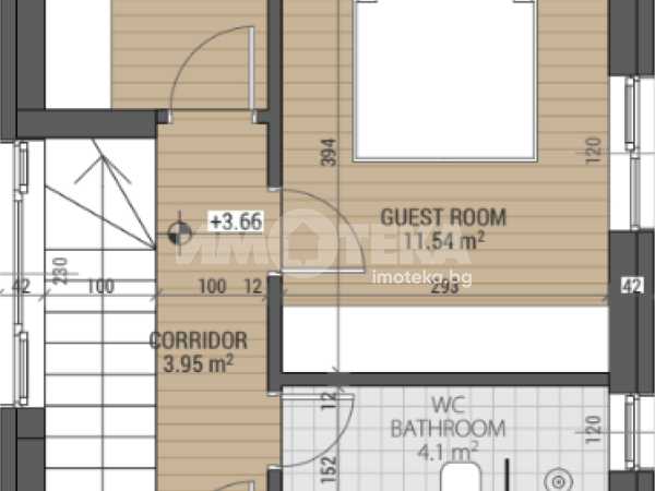 Кокетна двуетажна къща в богато озеленен комплекс. РЗП на къщата-156,46 кв.м.; застроена площ Етаж 1-79,82 кв.; застроена площ; етаж 2-76,64 кв. м. Към имота има прилежащ двор с площ- 322,74 кв. м., от които двор + веранда-242,93 кв. м. Разпределение: дневен тракт с кухня, сервизно помещение, тоалетна, градински склад, двор + веранда, 3 спални, 2 бани с тоалетни. Изложение: Изток, Запад. Две ПМ в имота.