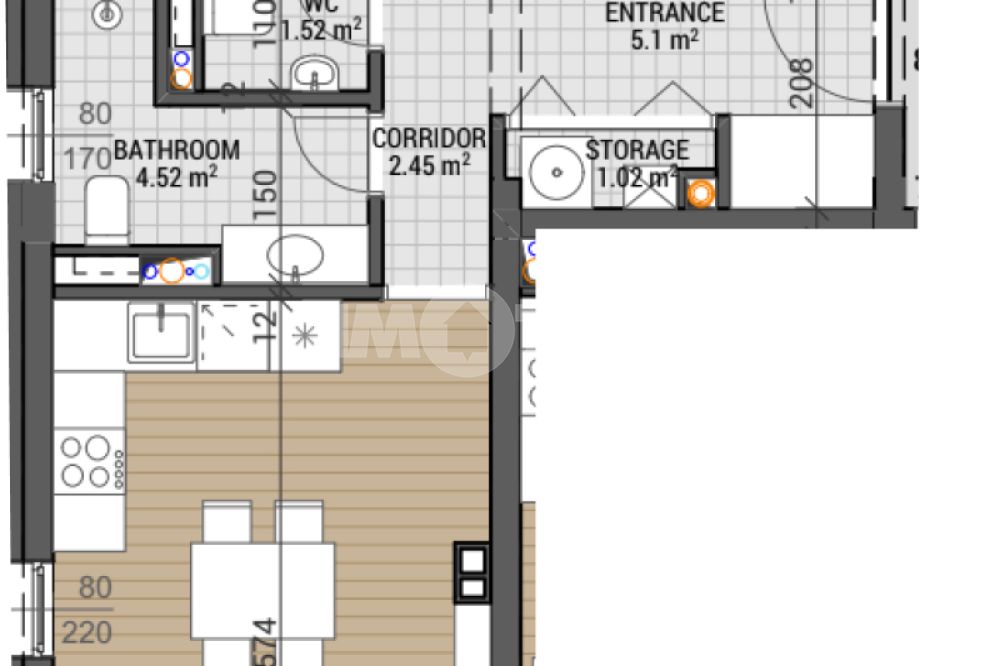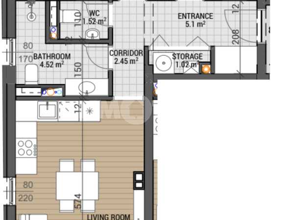 Тристаен апартамент на етаж ТРЕТИ със ЗП-84,21 кв.м., РЗП-104,55 кв.м., идеални части от парцела равняващи се на 87,90 кв.м. разпределение: дневен тракт с кухня, 2 спални, баня с тоалетна, тоалетна, склад, лоджия. Изложение: Североизток, Югозапад.