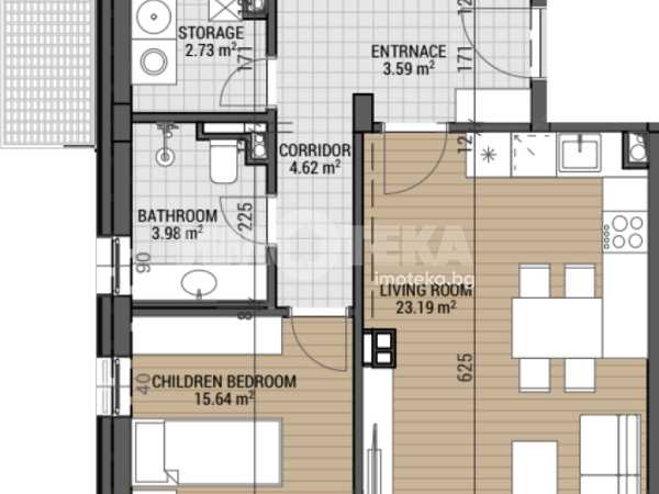 Тристаен апартамент на етаж ВТОРИ със ЗП-97,58 кв.м., РЗП-124,98 кв.м., идеални части от парцела равняващи се на 101,86 кв.м. Разпределение: Дневен тракт с кухня, 2 спални, 2 бани с тоалетни, склад, лоджия. Изложение: Север, Юг, Запад.