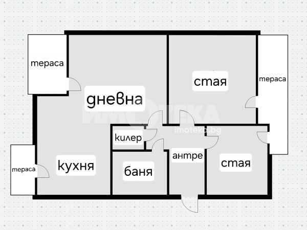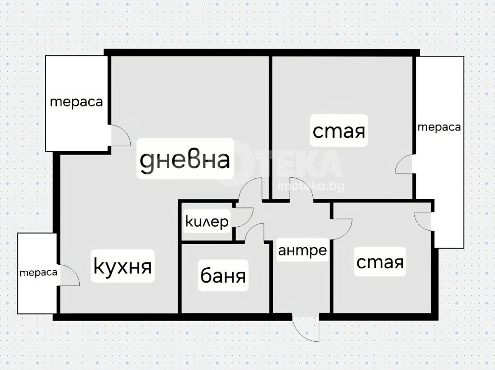 Завършен и обзаведен тристаен апартамент, готов за нанасяне. Жилището е със застроена площ от 103 кв.м. и се състои от: антре, дневна с трапезария и кухненски бокс с излаз на 2 западни балкона, две непреходни спални, едната от които с тераса с източно изложение, баня с тоалетна и килер.