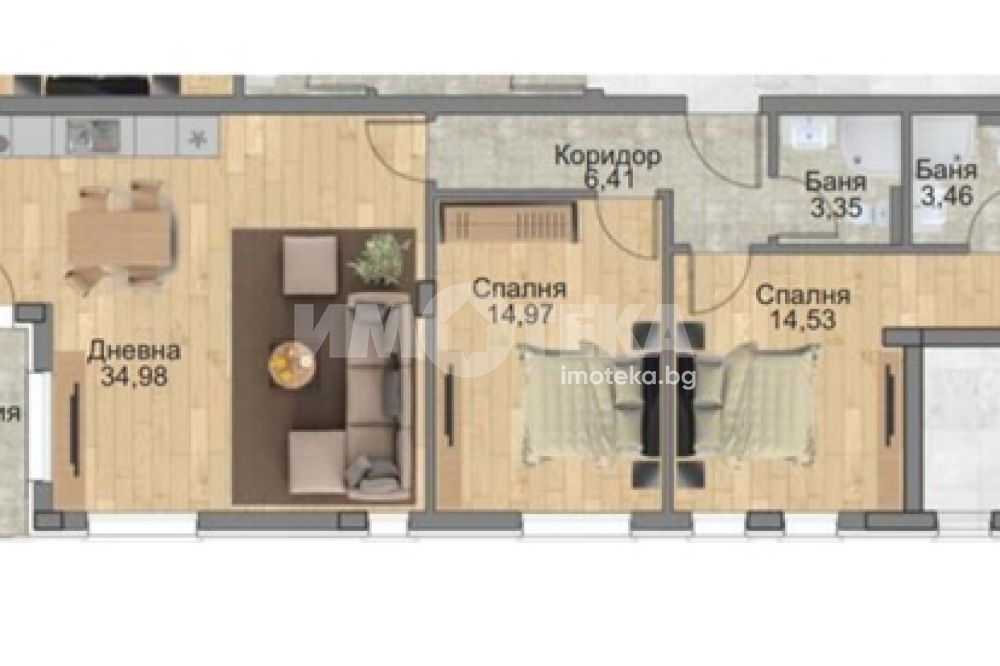 Състои се от просторна дневна с кухненкси бокс, две самостоятелни спални, две бани, дрешник и тераса.