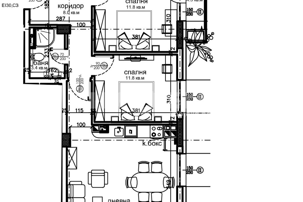 Разпределение: Просторна дневна зона с големи прозорци, които осигуряват много естествена светлина, три спални, две бани с тоалетна, складово помещение, две тераси и антре.