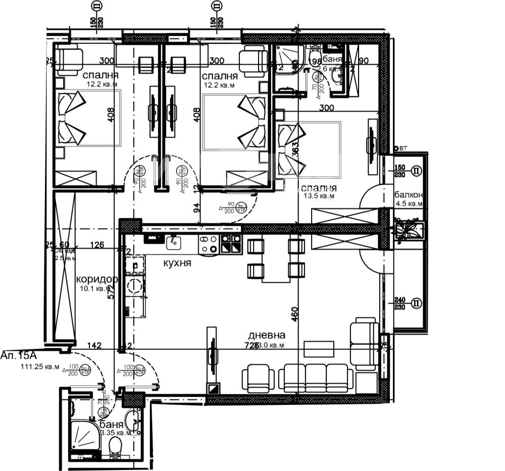Разпределение: Просторна дневна зона с големи прозорци, които осигуряват много естествена светлина, три спални, две бани с тоалетна, складово помещение, две тераси и антре.