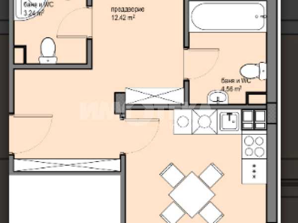 Tристаен апартамент, състоящ се от: трапезария с кухненски бокс , спални 2 броя., баня с тоалетна 2 броя , антре ,склад и две тераси .застроена площ 90,25кв.м Има възможност за закупуване на подземно паркомясто.Изложение Ю/И