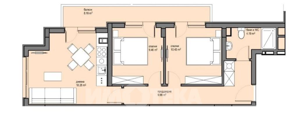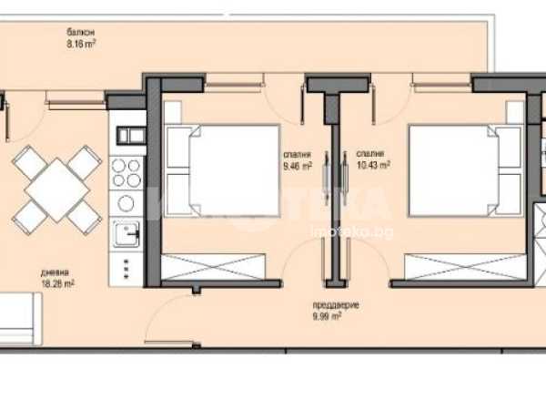 Тристаен апартамент със застроена площ от 68.49 кв.м. Състои се от: коридор, трапезария с кухненски бокс, две непреходни спални, баня с тоалетна, склад и балкон. Изложението е югозападно. Има възможност за закупуване на подземни паркоместа.