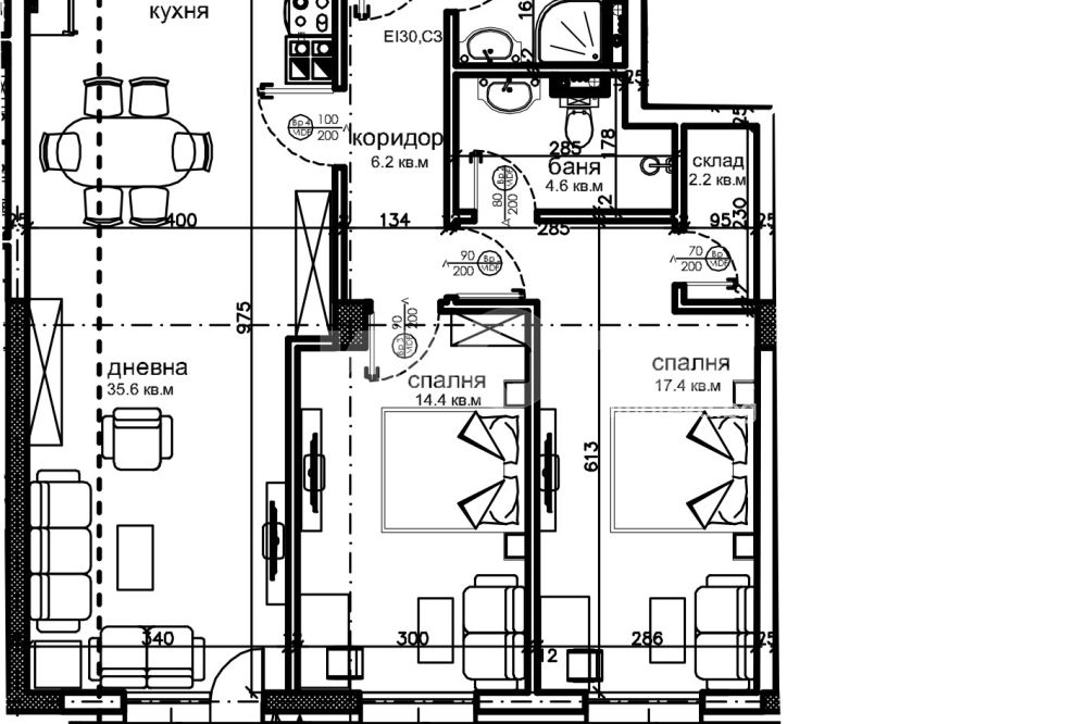 Разпределение: Просторна дневна зона с големи прозорци, които осигуряват много естествена светлина, две спални, две бани с тоалетна, складово помещение, тераса и антре.