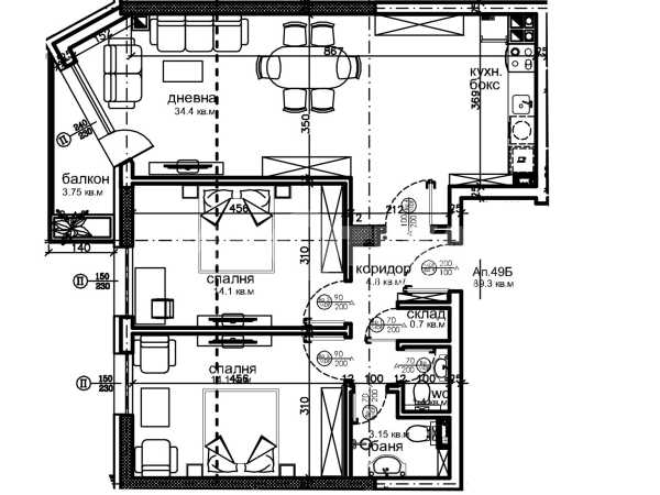 Разпределение: Просторна дневна зона с големи прозорци, които осигуряват много естествена светлина, две спални, баня с тоалетна, отделна тоалетна, складово помещение, тераса и антре.