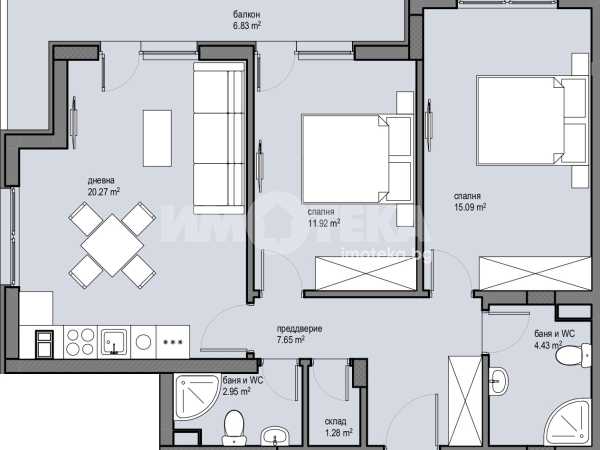 Тристаен апартамент със застроена площ от 83.38 кв.м. и следното разпределение: преддверие, две спални по 11,92 кв.м. и 15,09 кв.м., две бани с тоалетни по 2,95 кв.м. и 4,43 кв.м., трапезария с кухненски бокс - 20,27 кв.м., склад и балкон. Западно изложение с гледка към вътрешен двор и междублоково пространство.Апартамент с функционално разпределение и изложение,което предлага спокойствие и тишина.