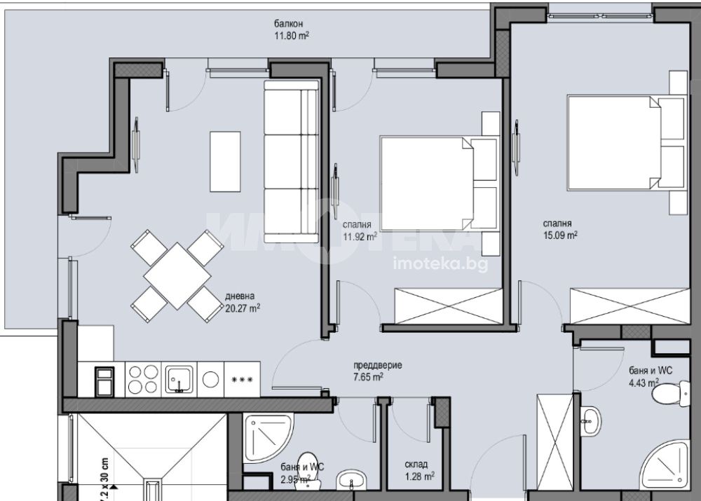 Тристаен апартамент със застроена площ 88,93 кв.м. и следното разпределение: преддверие, две спални по 11,92 кв.м. и 15,09 кв.м., две бани с тоалетни по 2,95 кв.м. и 4,43 кв.м., трапезария с кухненски бокс - 20,27 кв.м., склад и балкон. Западно изложение с гледка към вътрешен двор и междублоково пространство.Апартамент с функционално разпределение и изложение,което предлага спокойствие и тишина.