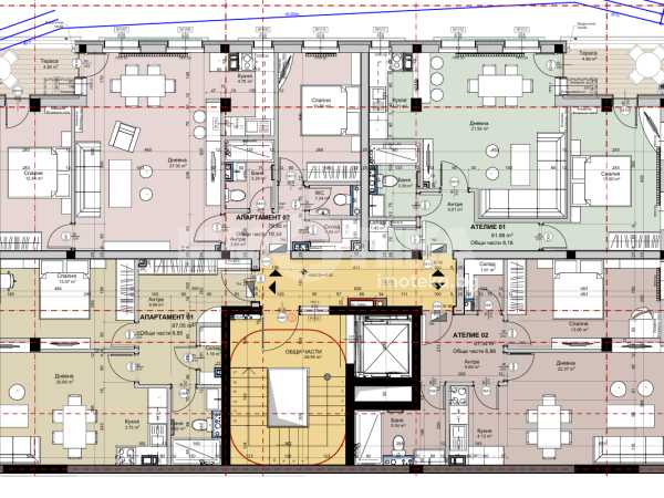 Ателие 1 с чиста жилищна площ 61.88кв.м., състоящ се от дневна с кухненски кът (25.77кв.м.), спалня (13.60кв.м.), баня с тоалетна (3.39кв.м.), складово помещение (1.43кв.м.) и тераса (4.80кв.м.)