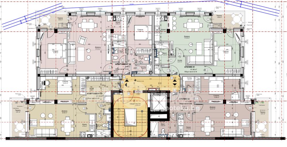 Ателие 2 с чиста жилищна площ 67.34кв.м., състоящо се от дневна с кухненски кът (26.49кв.м.), спалня (13.60кв.м.), баня с тоалетна (5.34кв.м.), складово помещение (1.91кв.м.) и тераса (5.81кв.м.)