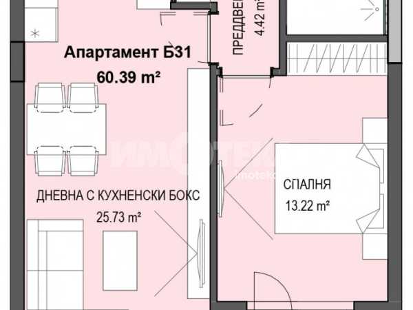 Разпределение: предварие, дневна с кухненски бокс, спалня, баня с тоалетна и балкон.