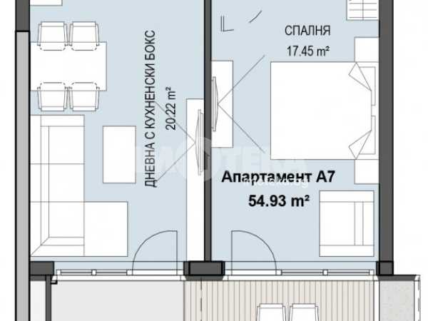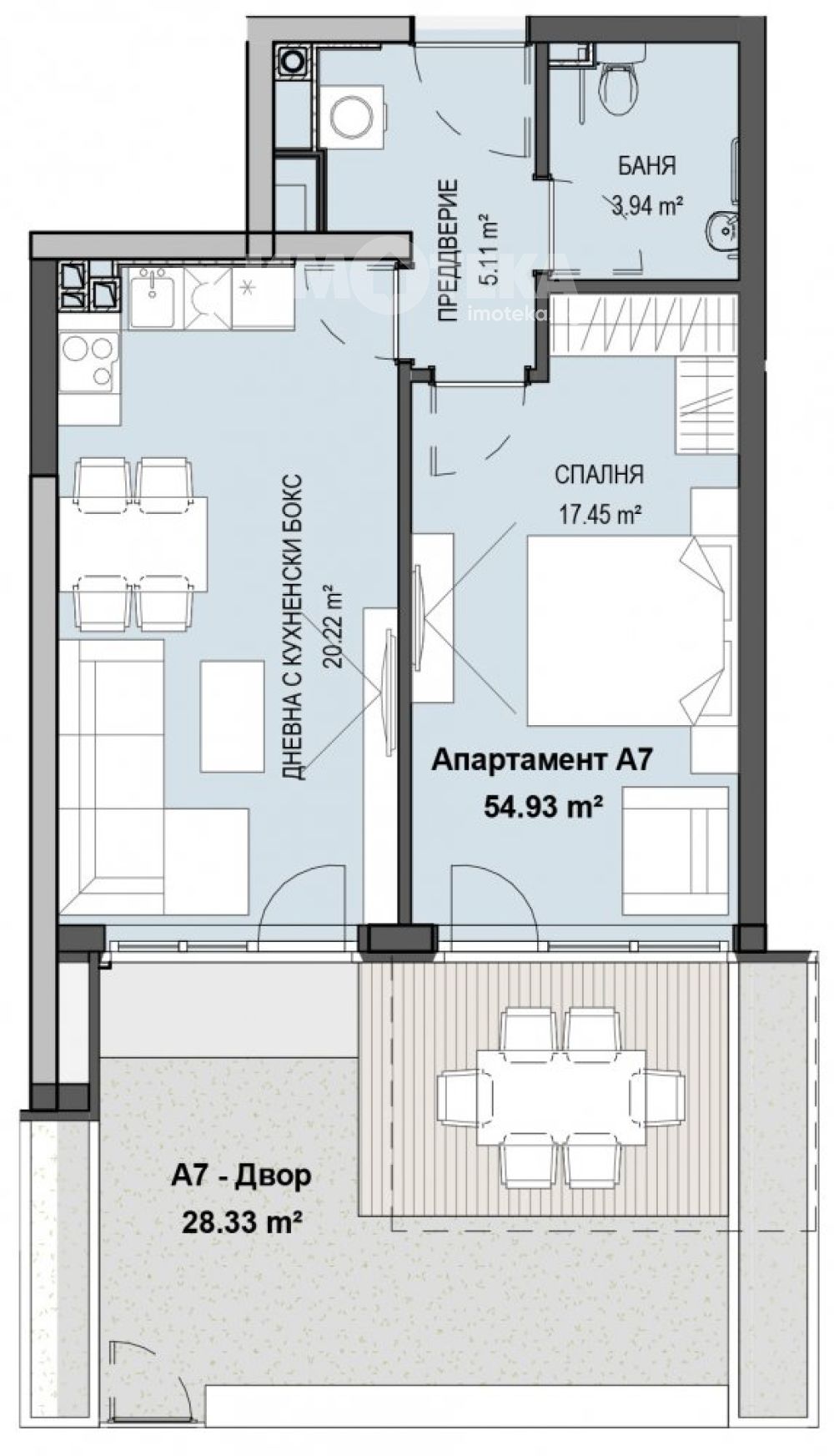 Разпределение: предварие, дневна с кухненски бокс, спалня, баня с тоалетна и Двор - 28.33 кв.м.