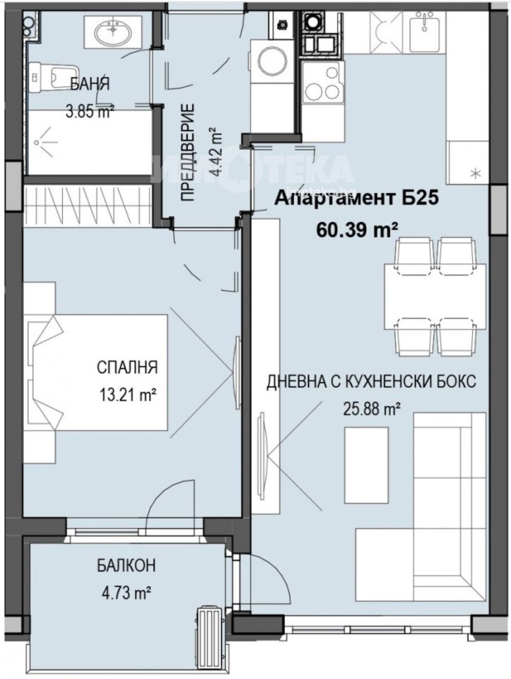 Тристаен апартамент, състоящ се от антре, два санитарни възела, две спални, дневна с кухненски бокс с излаз на тераса тип лоджия.