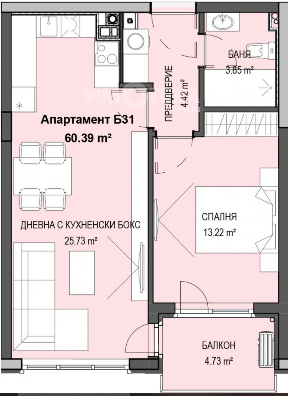 Двустаен апартамент състои се от антре, санитарен възел, спалня, дневна с кухненски бокс с излаз на тераса тип лоджия. Цената е със ДДС.