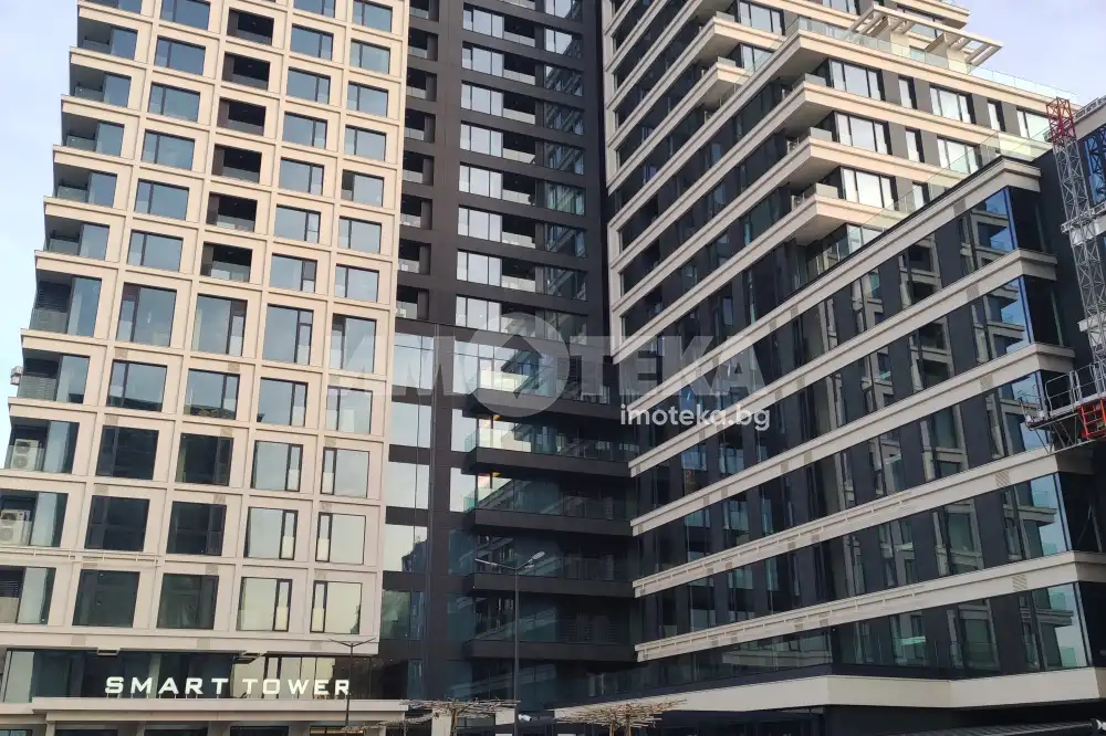 Предлагаме двустаен апартамент с Акт 16, в емблематичната сграда "Smart Tower" на етаж 12, с площ 89 кв.м. Жилището разполага с просторни помещения и страхотна панорама. Имотът се предава с положени подови настилки и латекс, отоплението и охлаждане е решено с термопомпа и конвектори. Разпределение: Дневен тракт с кухненска част, спалня, баня с тоалетна, склад, антре и лоджия. Има възможност за закупуване на подземно паркомясто.