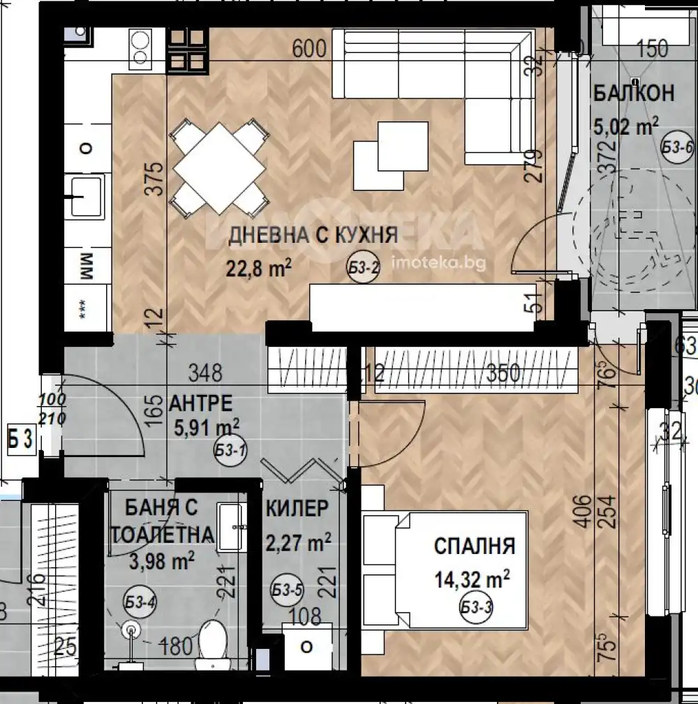 Функционален двустаен апартамент с чиста площ 63,09 кв. м., състоящ се от дневна с кухня 23 кв.м., спалня 14 кв. м., санитарен възел, килер и тераса.