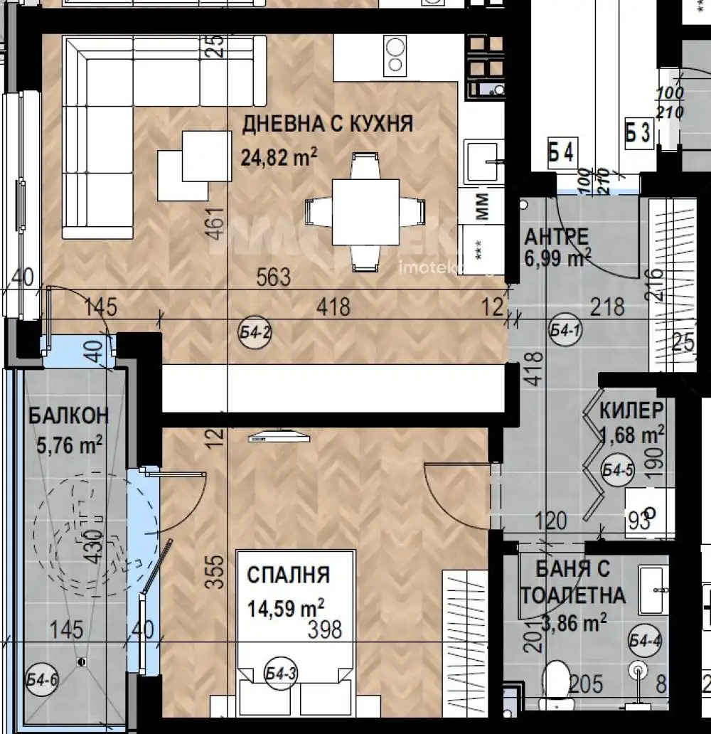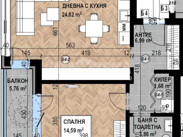 Функционален двустаен апартамент с чиста площ 66,76 кв. м., състоящ се от дневна с кухня 25 кв.м., спалня 15 кв. м., санитарен възел, килер и тераса.