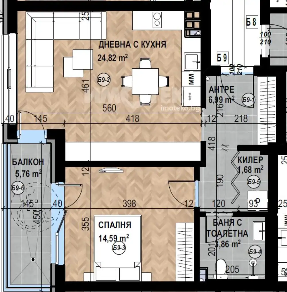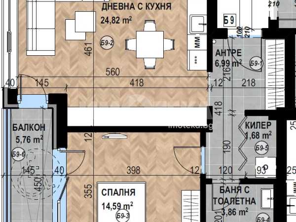 Функционален двустаен апартамент с чиста площ 66,76 кв. м., състоящ се от дневна с кухня 25 кв.м., спалня 15 кв. м., санитарен възел, килер и тераса.