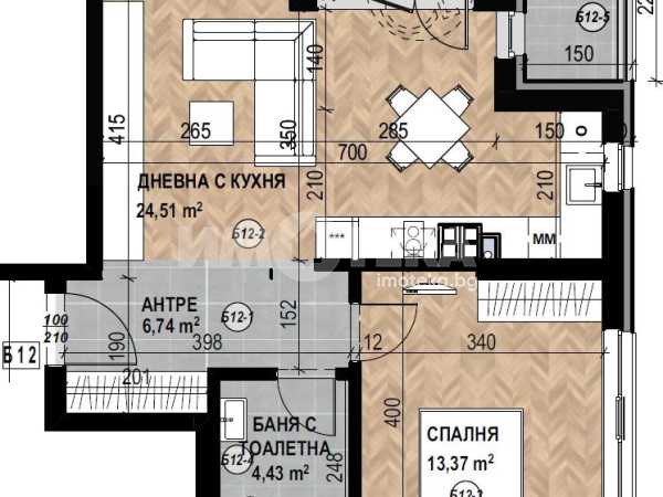 Функционален двустаен апартамент с чиста площ 64,97 кв. м., състоящ се от дневна с кухня 25 кв.м., спалня 13 кв. м., санитарен възел и тераса.