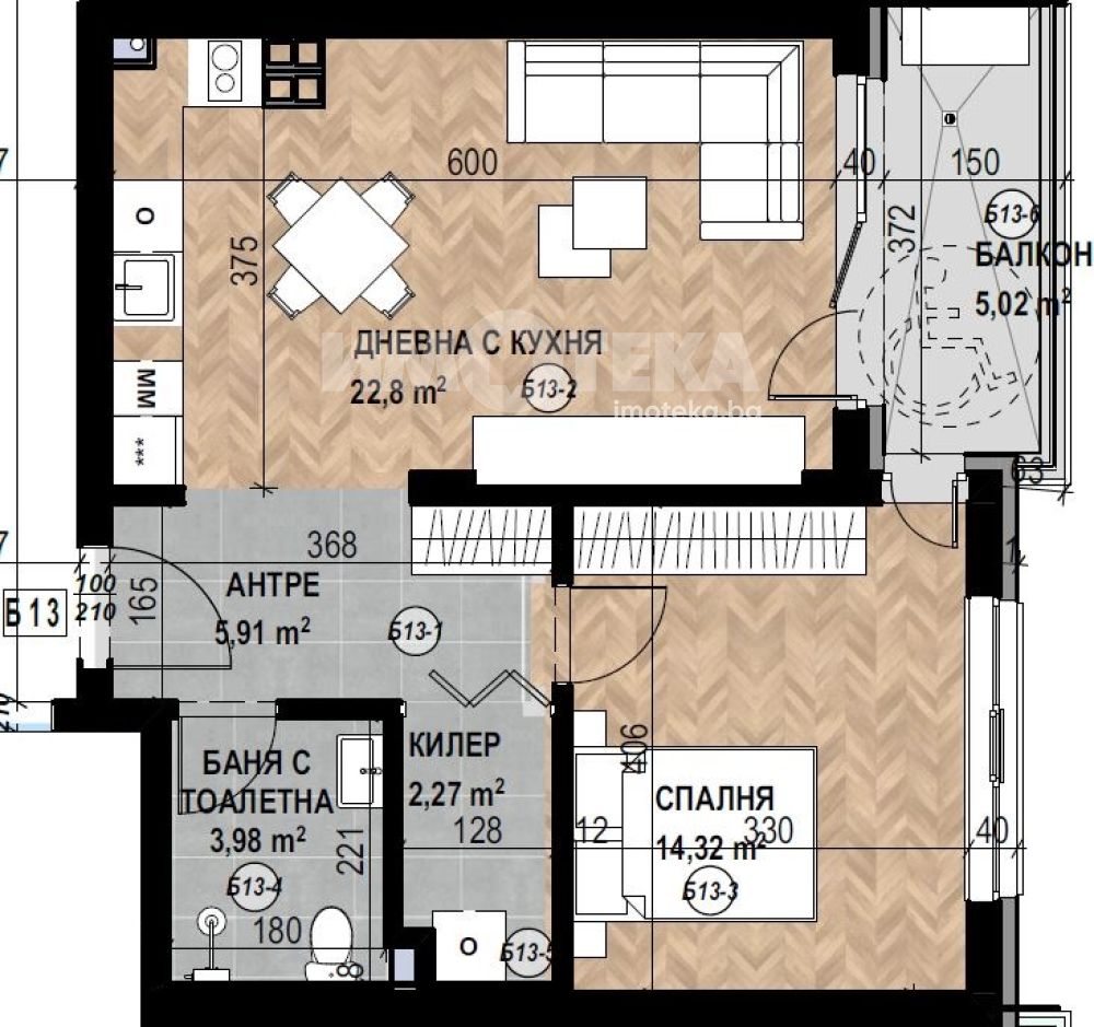 Функционален двустаен апартамент с чиста площ 63,09 кв. м., състоящ се от дневна с кухня 23 кв.м., спалня 14 кв. м., санитарен възел, килер и източен балкон.