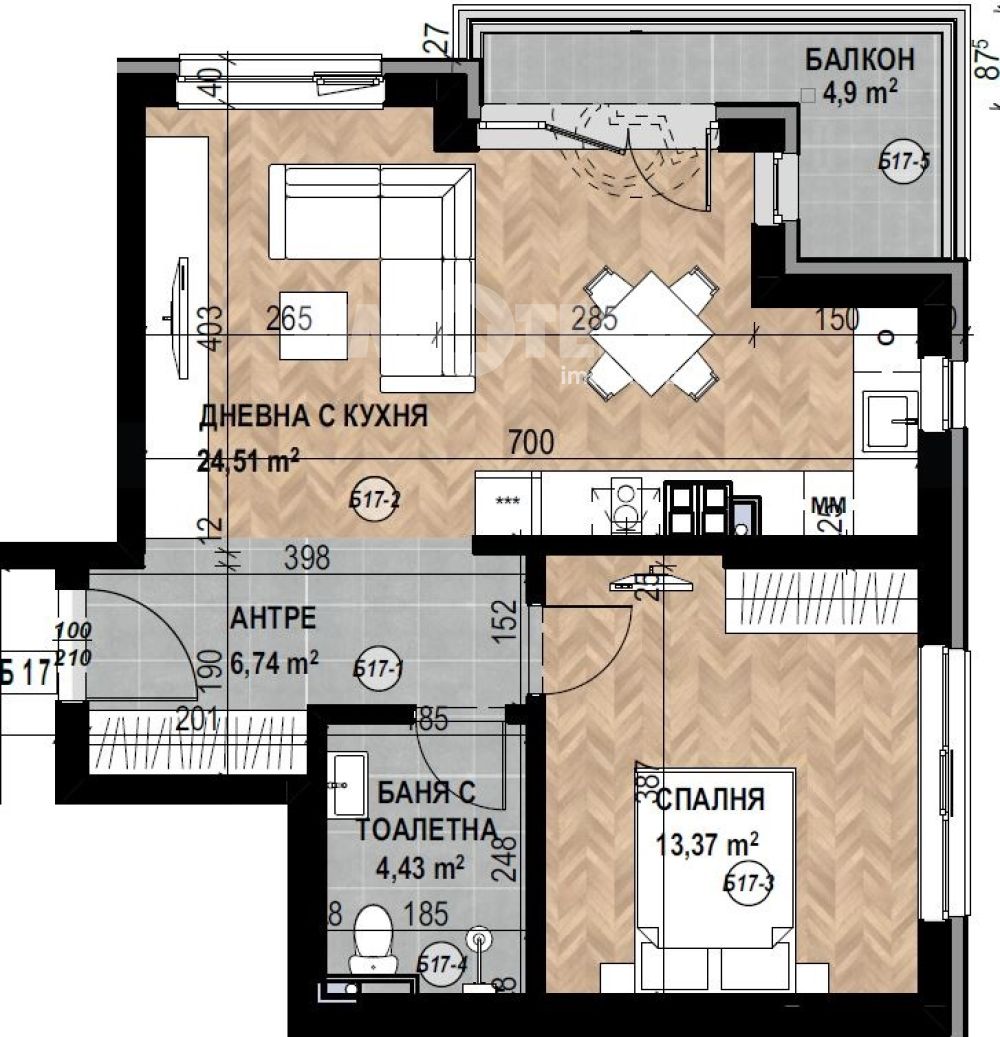 Функционален двустаен апартамент с чиста площ 64,97 кв. м., състоящ се от дневна с кухня 25 кв.м., спалня 13 кв. м., санитарен възел и тераса.