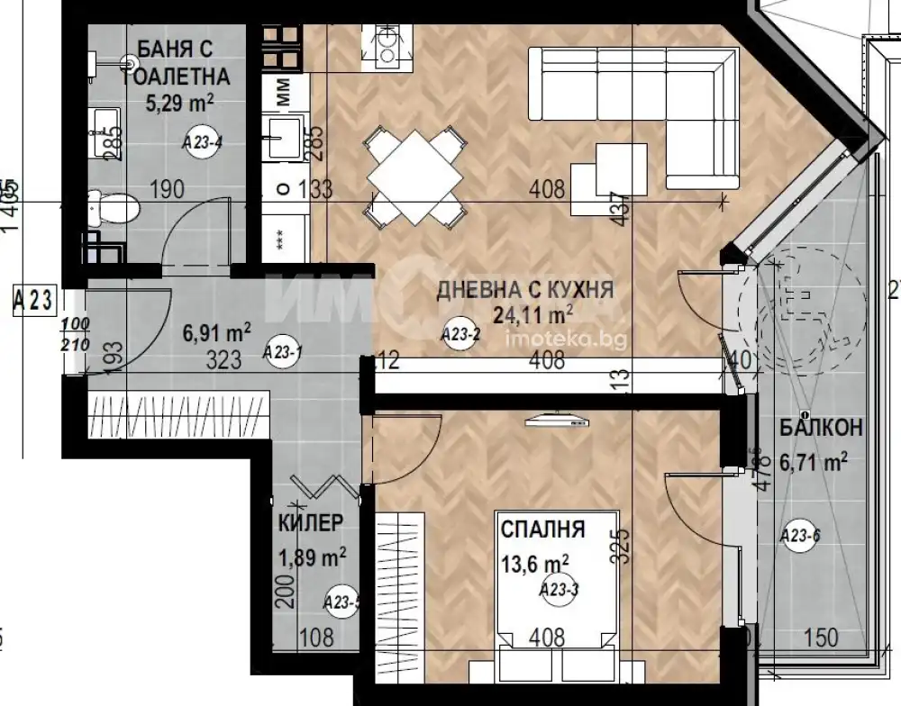 Функционален двустаен апартамент с чиста площ 67,16 кв. м., състоящ се от дневна с кухня 24 кв.м., спалня 14 кв. м., санитарен възел, килер и тераса.