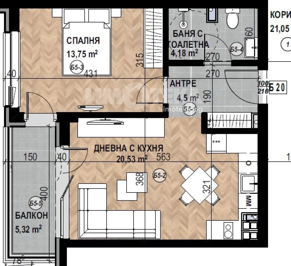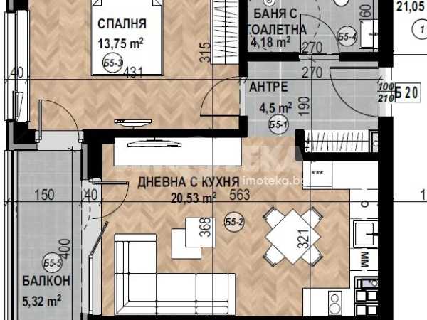 Фукционален двустаен апартамент с чиста площ 55,83 кв. м., състоящ се от дневна с кухня 21 кв.м., спалня 14 кв. м., санитарен възел, западен балкон.