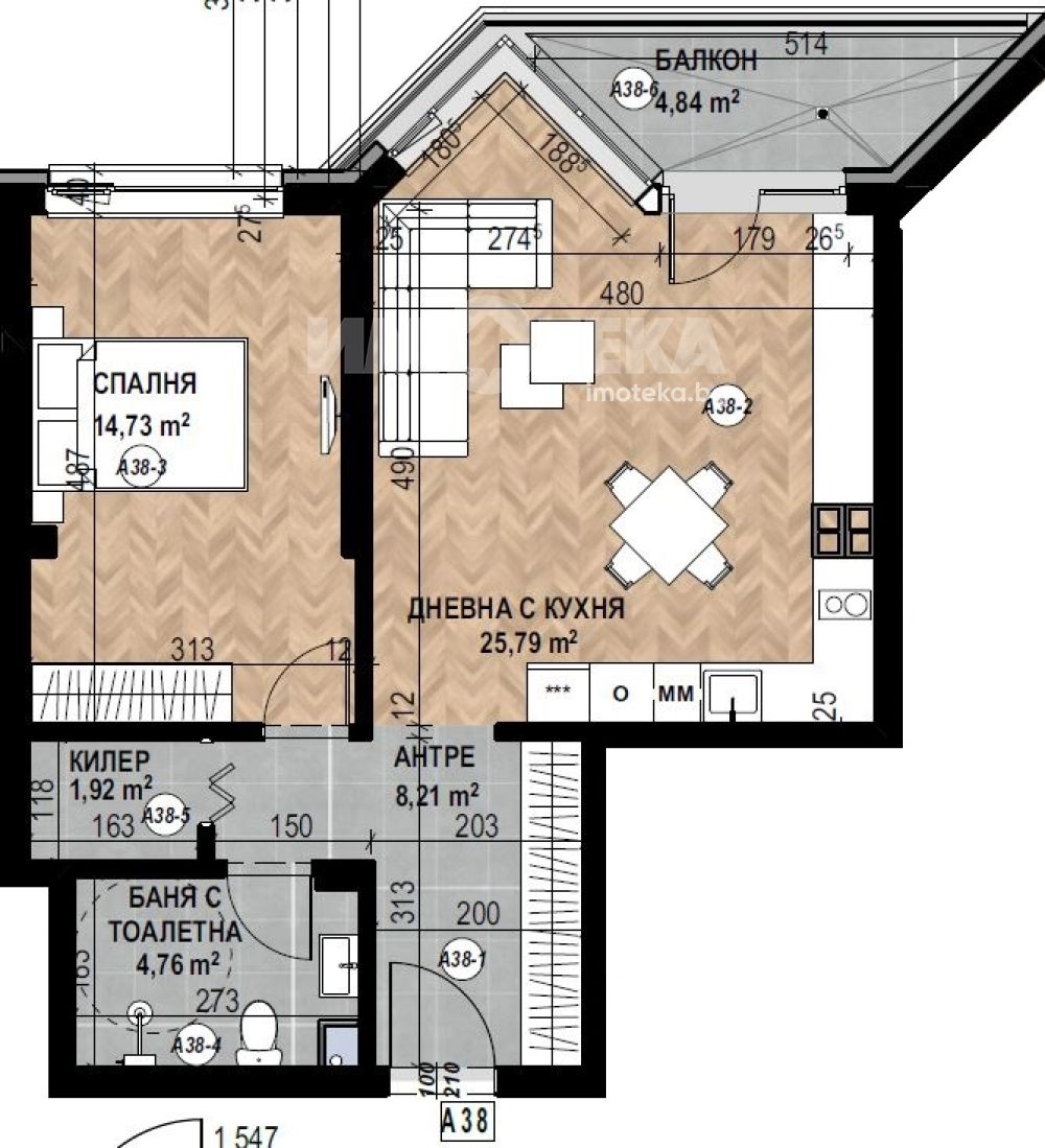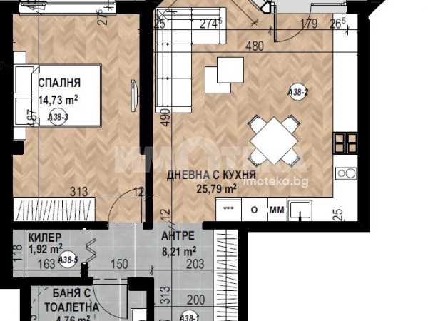Фукционален двустаен апартамент с чиста площ 70,08 кв. м., състоящ се от дневна с кухня 26 кв.м., спалня 15 кв. м., санитарен възел, килер и северна тераса.