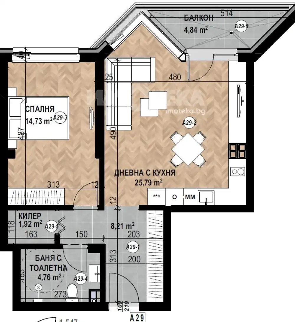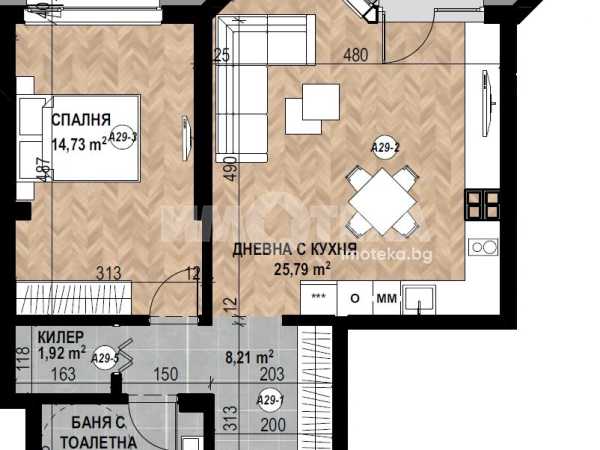 Фукционален двустаен апартамент с чиста площ 70,08 кв. м., състоящ се от дневна с кухня 26 кв.м., спалня 15 кв. м., санитарен възел, килер и северна тераса.