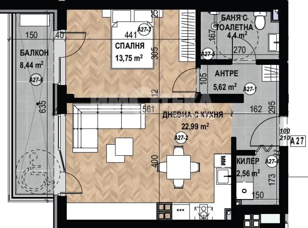 Фукционален двустаен апартамент с чиста площ 66,73 кв. м., състоящ се от дневна с кухня 23 кв.м., спалня 14 кв. м., санитарен възел, килер и западна тераса.