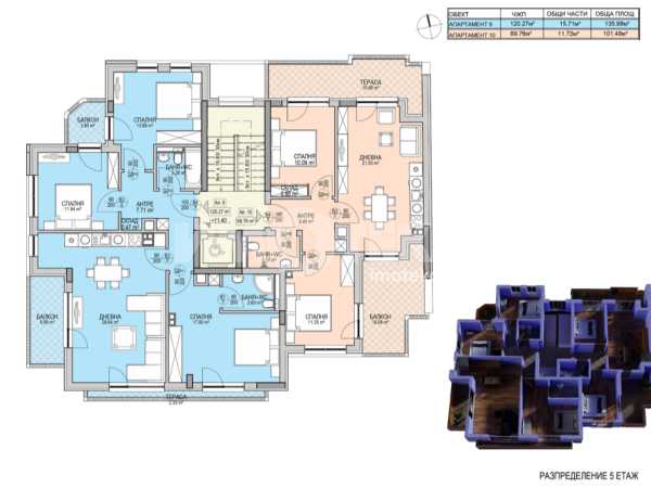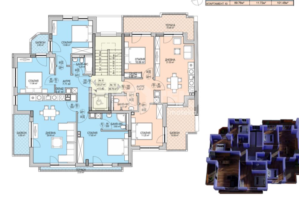 Многостаен тухлен апартамент с площ 120,27кв.м./ 135,98кв.м. с общи части и следното разпределението : входно антре, всекидневна с трапезария и кухненски бокс - 28,64кв.м., три спални /17,90кв.м. ,13,68кв.м. и 11,94кв.м./ , две бани с тоалетни , склад и две тераси.