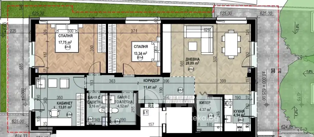 Фукционален четиристаен апартамент с чиста площ 120,68 кв. м., състоящ се от дневна с кухня 29 кв.м., две спални съответно по 18 и 13 кв. м., кабинет - 13 кв.м., два санитарни възела, килер и двор 96,12 кв.м.