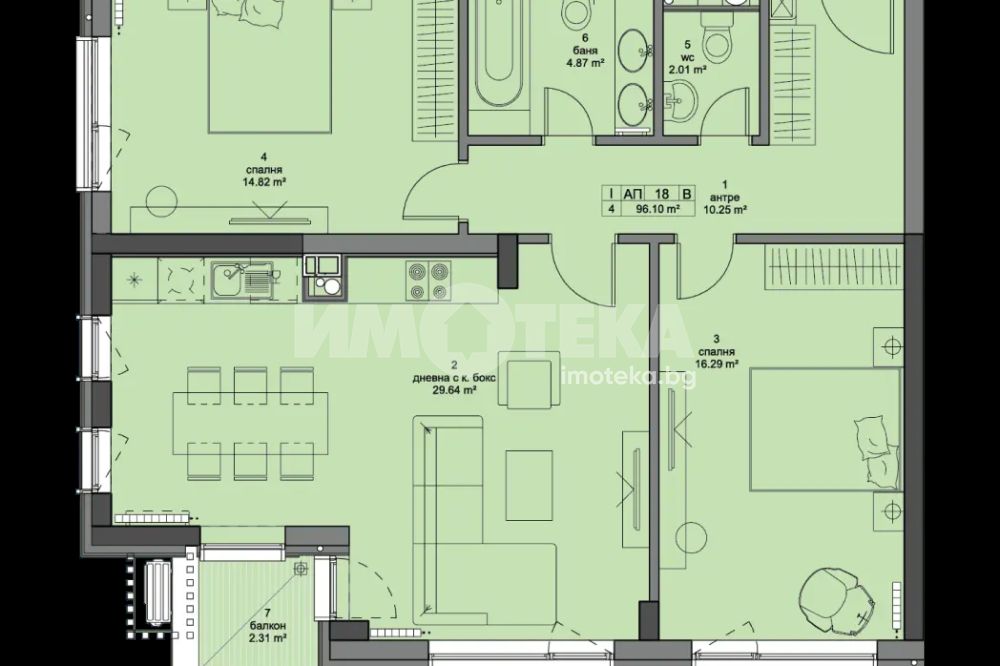Тристаен апартамент с югозападно изложение. Състои се от антре, дневна с кухня и трапезария, 2 спални, баня с тоалетна, отделна тоалетна, склад и балкон с излаз от всекидневната. РЗП 114,3кв.м, ЗП 96,1кв.м. Възможност за закупуване на паркомясто.