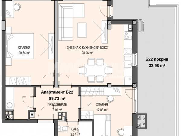Разпределение: предверие, дневна с кухненски бокс, две спални, едно санитарно помещение, склад и ПОКРИВНА ТЕРАСА 32.90 кв.м.