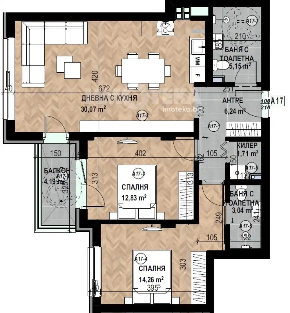 Тристаен апартамент с чиста площ 90,39 кв.м., састоящ се от дневна с кухня 30 кв. м., две спални съответно по 13 и 14 кв. м., два санитарни възела, килер и балкон.