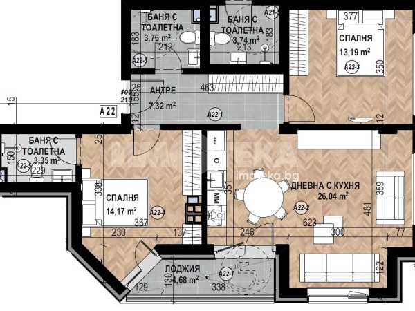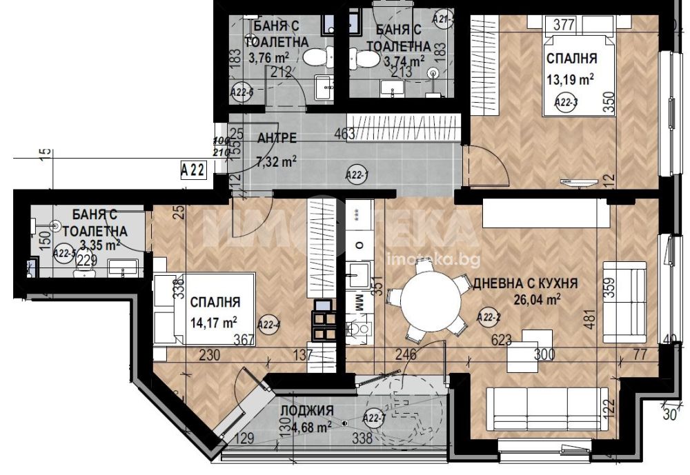 Функционален тристаен апартамент с чиста площ 86,64 кв. м., състоящ се от дневна с кухня 26 кв.м., две спални съответно по 13 и 14 кв. м., два санитарни възела и южна лоджия.