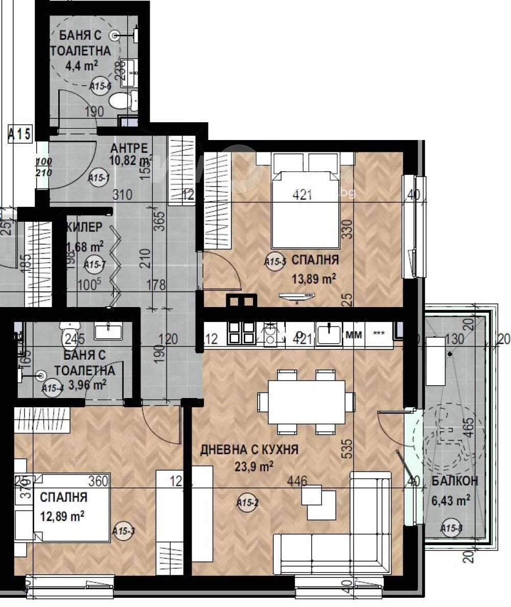 Фукционален тристаен апартамент с чиста площ 92,77 кв. м., състоящ се от дневна с кухня 24 кв.м., две спални съответно по 13 и 14 кв. м., два санитарни възела и източен балкон.