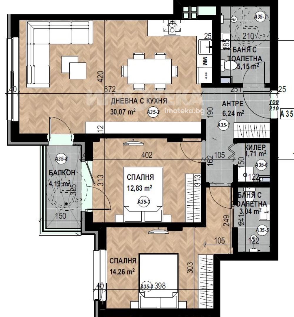 Тристаен апартамент с чиста площ 90,39 кв.м., састоящ се от дневна с кухня 30 кв. м., две спални съответно по 13 и 14 кв. м., два санитарни възела, килер и балкон.