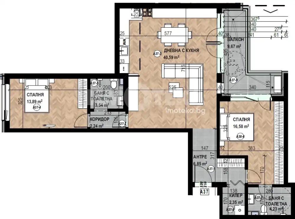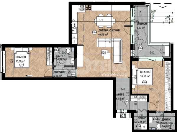 Тристаен апартамент с чиста площ 114,23 кв. м., състоящ се оат дневна с кухня 41 кв.м, две спални съответно от 17 и 14 кв.м., два санитарни възела, килер и източен балкон.
