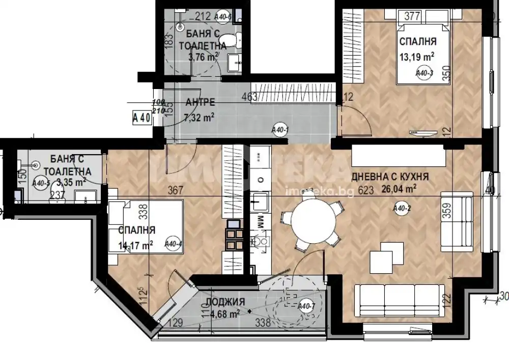 Функционален тристаен апартамент с чиста площ 86,64 кв. м., състоящ се от дневна с кухня 26 кв.м., две спални съответно по 14 кв.м., два санитарни възела и южна лоджия.